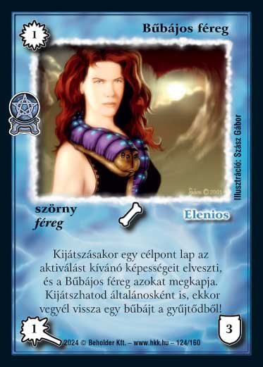 Kiadás: Varázsdimenzió Gyakoriság: nem gyakori Lapszín (isten): Elenios Típus: szörny Altípus: féreg Szöveg: Kijátszásakor egy célpont lap az aktiválást kívánó képességeit elveszti, és a Bűbájos féreg azokat megkapja. Kijátszhatod általánosként is, ekkor vegyél vissza egy bűbájt a gyűjtődből! Illusztráció: Szász Gábor
