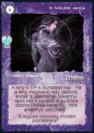 Szöveg: A lény 4 ÉP-s Büntetést kap. Ha a lény megsebez egy játékost, ennek a játékosnak feleannyi lapot kell a kezéből a gyűjtőbe dobnia (felfelé kerekíts), mint amennyit sebződött.